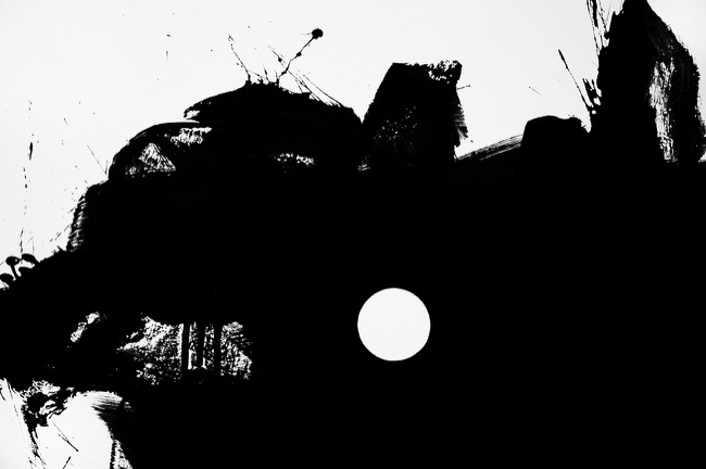 7 pre-primed canvases with cut and extracted circles, each 30 x 30cm, black emulsion paint on wall
