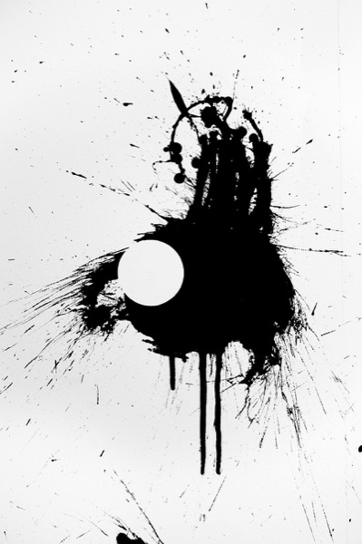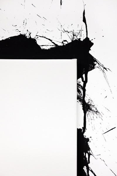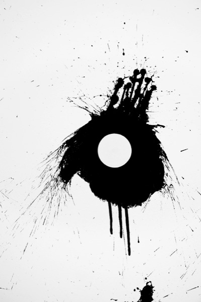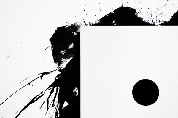 7 pre-primed canvases with cut and extracted circles, each 30 x 30cm, black emulsion paint on wall
